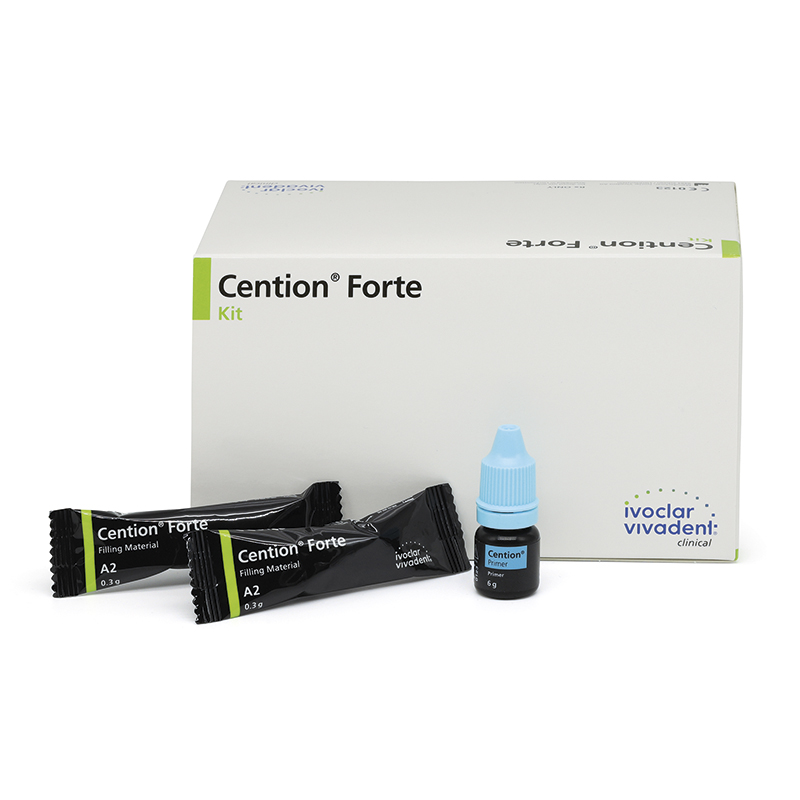 Cention Forte es un material de obturación radiopaco autopolimerizable con opción de fotopolimerización. Para restauraciones directas de dientes anteriores y posteriores en las superficies oclusales. Cention Forte libera iones de flúor, calcio e hidróxido.