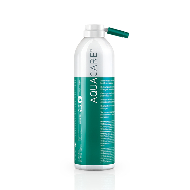 AQUACARE es un spray de limpieza para piezas de mano y contra-ángulos utilizados con líquido fisiológico. Particularmente indicado para instrumentos de implantología y de cirugía dental. Limpia los conductos de irrigación y disuelve las impurezas.